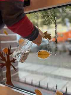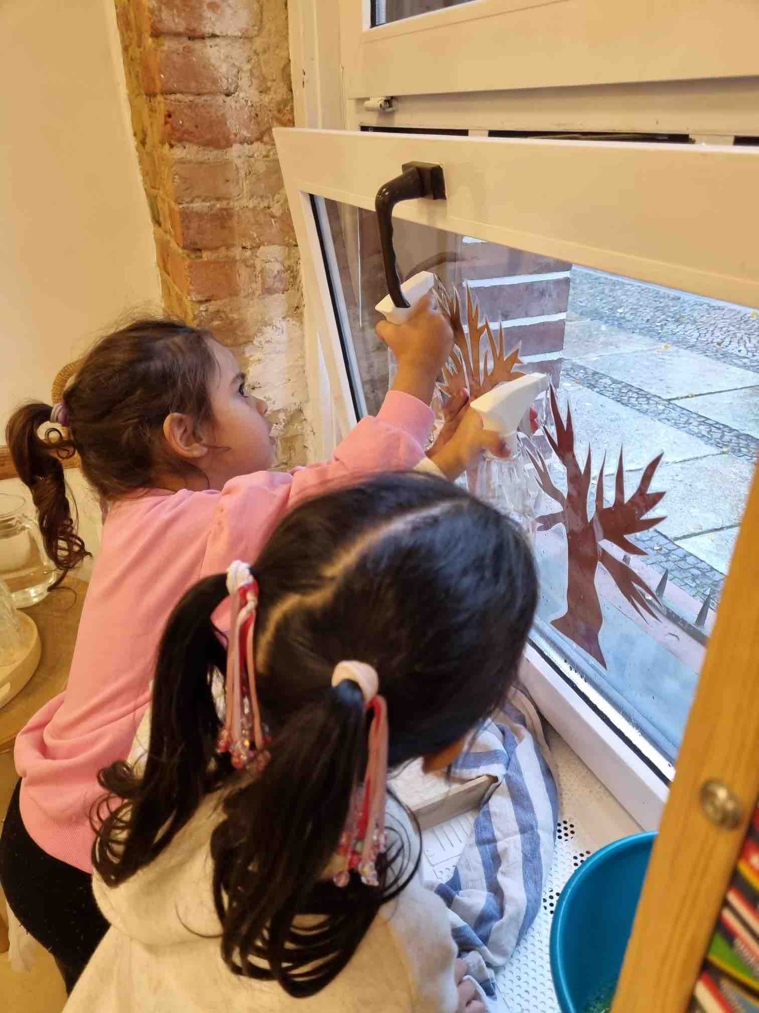 Jeden Tag finden sich ganz selbständig Kinder, die das Fenster neu mit Blättern gestalten: ein kurzes Sprüh - und das Blatt ist am Fenster befestigt.