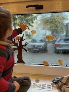 Dafür braucht es gute Spielanregung durch die Pädagoginnen. Hier haben sie mit den Kindern bunte Herbstblätter gesammelt, gepresst und laminiert. Das Fenster wurde mit einem Baum bemalt. Die Blätter liegen mit einer Sprühflasche mit Wasser auf dem Fensterbrett bereit.