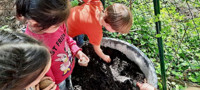 Im Garten haben wir einen kleinen Kompost angelegt, können zwischen Sträuchern verstecken oder auf der Freifläche Fußball spielen. Es gibt viel zu entdecken, und wir haben immer wieder interessante Anregungen mit den Kindern angebracht, die sie dann erforschen und bespielen.