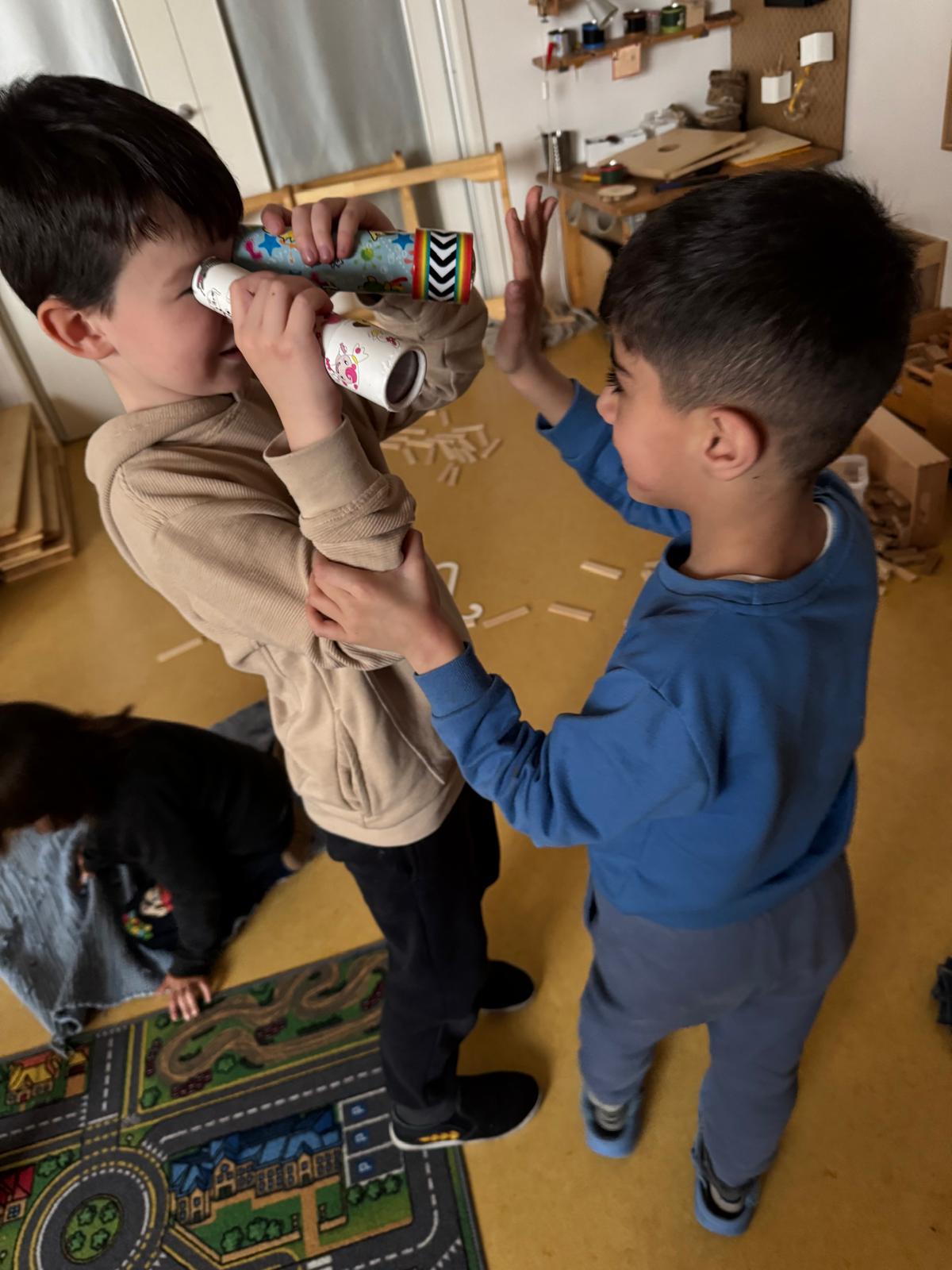 Mohammed zeigt mit den Fingern eine Zahl, und Leon schaut durch das Kaleidoskop und versucht die Zahl zu identifizieren. Eine komplexe Aufgabe für das Köpfchen - gar nicht so einfach ... Aber mit etwas Übung klappt es, den DURCHBLICK zu gewinnen.
