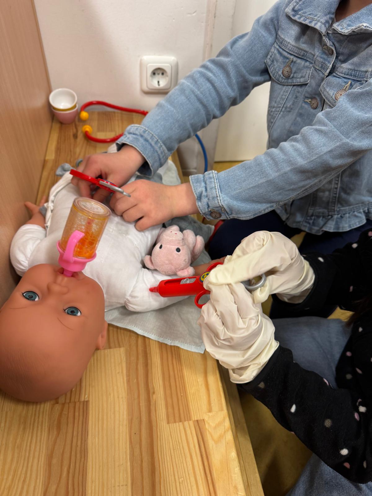 Hier steht eine Operation an, die das Puppenkind wieder gesund machen wird. Spritze, OP-Tisch und beruhigende Pfleger und Ärztinnen - alles da, was man braucht. Und künftige berufliche Perspektiven auch schon.