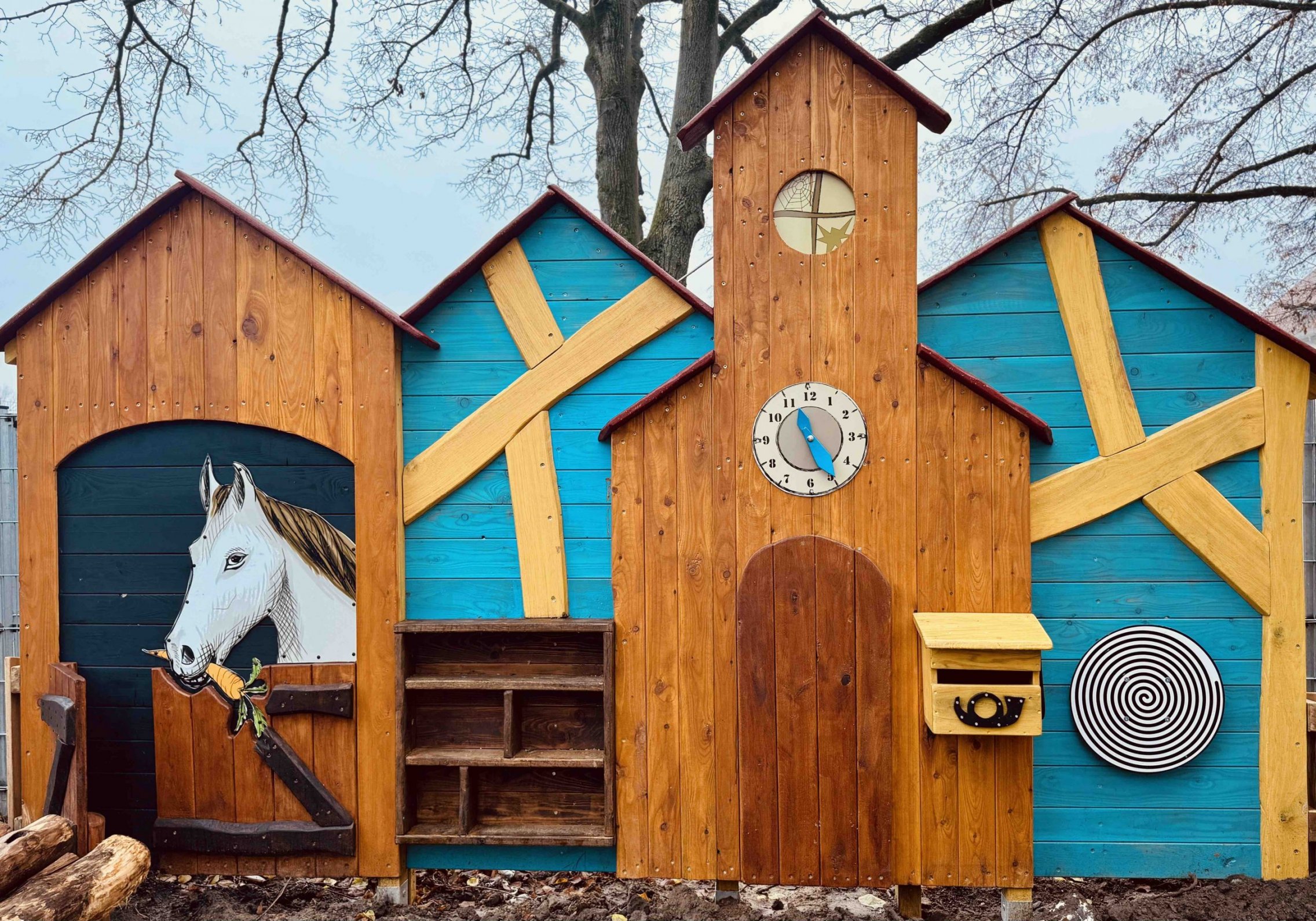Das Freigelände haben wir unter dem Thema "DORF" gestaltet: mit Pferdestall, Kirche, Sägewerk, Dorfbrunnen und Hofladen (der Rollrasen kommt im Frühjahr, denn jetzt würde er nicht anwachsen).